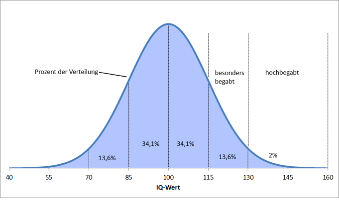bildung 1. Verteilung des IQs in der Bevölkerung. © Aljoscha NeubauerDer IQ gibt an, wie intelligent eine Testperson im Vergleich zu anderen Gleichaltrigen aus derselben Bevölkerung ist. Intelligenzvergleiche zwischen sehr unterschiedlichen Gruppen, etwa Völkern, sind unseres Erachtens nicht sinnvoll, weil Intelligenztests kulturell geprägt sind. Mit einem IQ von 100 verfügt man über durchschnittliche Intelligenz (siehe Abbildung 1). Zwei Drittel der Bevölkerung haben einen IQ zwischen 85 und 115. Rund 17 Prozent können mit einem IQ von mehr als 115 als überdurchschnittlich intelligent gelten, und 2 Prozent mit einem IQ von mehr als 130 als hochbegabt.