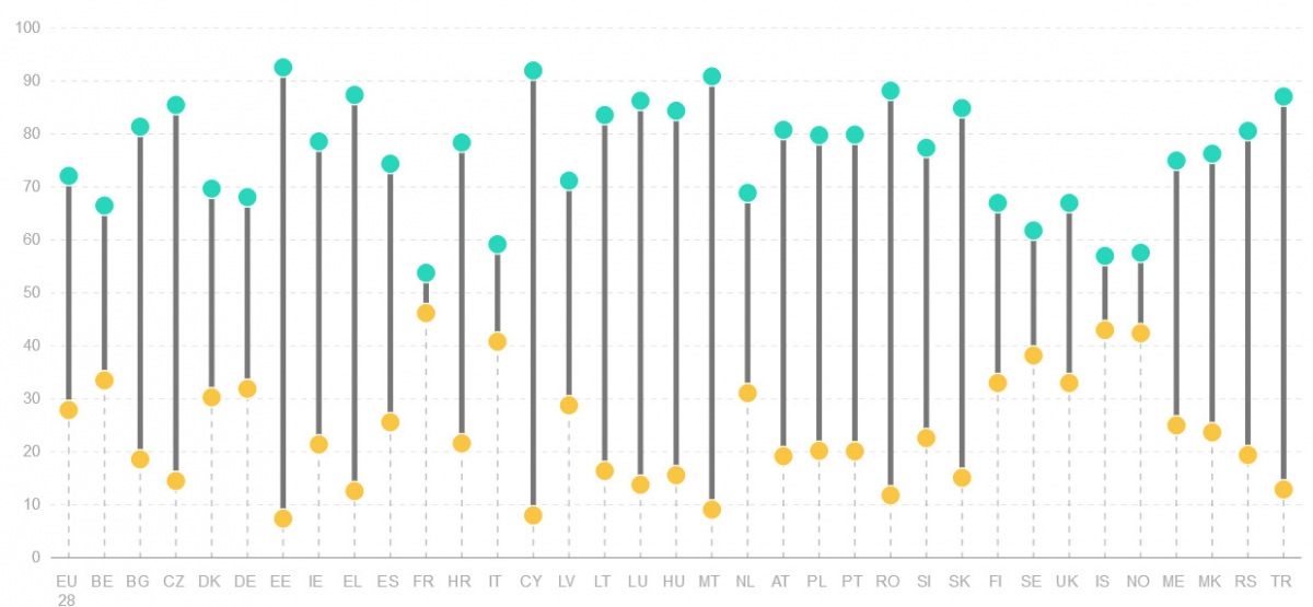 Bild 2: Geschlechterverteilung bei Aufsichtsratsmitgliedern (2017). Auf der Y-Achse ist der prozentuale Anteil an Aufsichtsratspositionen abgetragen, auf der X-Achse sind die einzelnen Länder dargestellt. Ein orangefarbener Punkt repräsentiert weibliche, ein blauer Punkt männliche Mitglieder. Je näher die beiden Punkte beieinander liegen, desto größer ist die Geschlechterparität