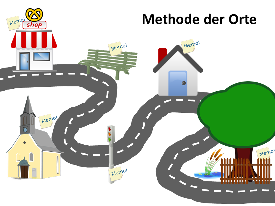 Eine davon ist die Methode der Orte (siehe Abbildung 1). Dabei erlernt man zunächst eine feste Abfolge von Orten, wie beispielsweise die Landmarken auf dem Weg zur Arbeit oder die Räu