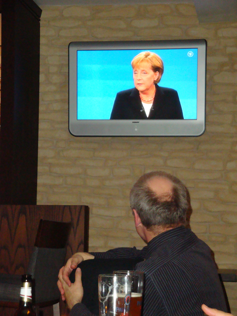 Bild 1: Zuschauer sehen Merkel im TV-Duell 2009 (Kanzlerduell (11) An diesen medienvermittelten Informationen orientiert sich ein Großteil unseres politischen Denkens und Handelns. Beispielsweise hat die politische Berichterstattung in Form von TV-Debatten einen Einfluss auf das Wahlverhalten (Benoit, Hansen, & Verser, 2003). Selbst fiktionale Fernsehserien wie The West Wing (Holbert et al., 2003) oder Filme mit politischen Inhalten wie JFK können politische Bewertungen, Überzeugungen, Einstellungen und Handlungsabsichten der Zuschauer/-innen beeinflussen.
