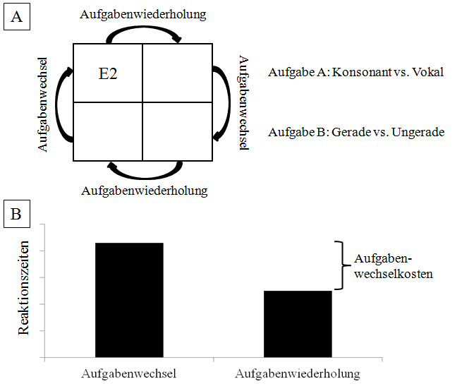 Die Untersuchung von exekutiven Funktionen für einen Wechsel zwischen Informationen wurde mit dem experimentellen Paradigma des Aufgabenwechsels durchgeführt (Abbildung 1). In diesem Paradigma wird ein Set von Reizen präsentiert, das mit unterschiedlichen Teilaufgaben belegt ist (z. B. Zahlen-Buchstabenpaare werden entweder mit einer Zahlenaufgaben [gerade vs. ungerade] oder mit einer Buchstabenaufgabe [Konsonant vs. Vokal] bearbeitet; Rogers & Monsell, 1995). Eine sequentielle und gemischte Präsentation dieser Teilaufgaben führt zu Durchgängen mit Wiederholungen derselben Aufgabe sowie zu Durchgängen mit Wechseln zwischen den verschiedenen Aufgaben. Ein Vergleich der Leistung in diesen beiden Situationen zeigt sogenannte Wechselkosten (Abbildung 1): Die Reaktionszeiten sind höher beim Wechsel zwischen den Aufgaben als bei Wiederholungen. Die Videospielerinnen und Videospieler zeigen aber im Vergleich zu den Nichtspielerinnen und Nichtspielern geringere Wechselkosten (z. B. Strobach, Frensch & Schubert, 2012), was ein erster Hinweis auf optimierte exekutive Funktionen für einen besseren Wechsel zwischen verschiedenen Informationen ist.