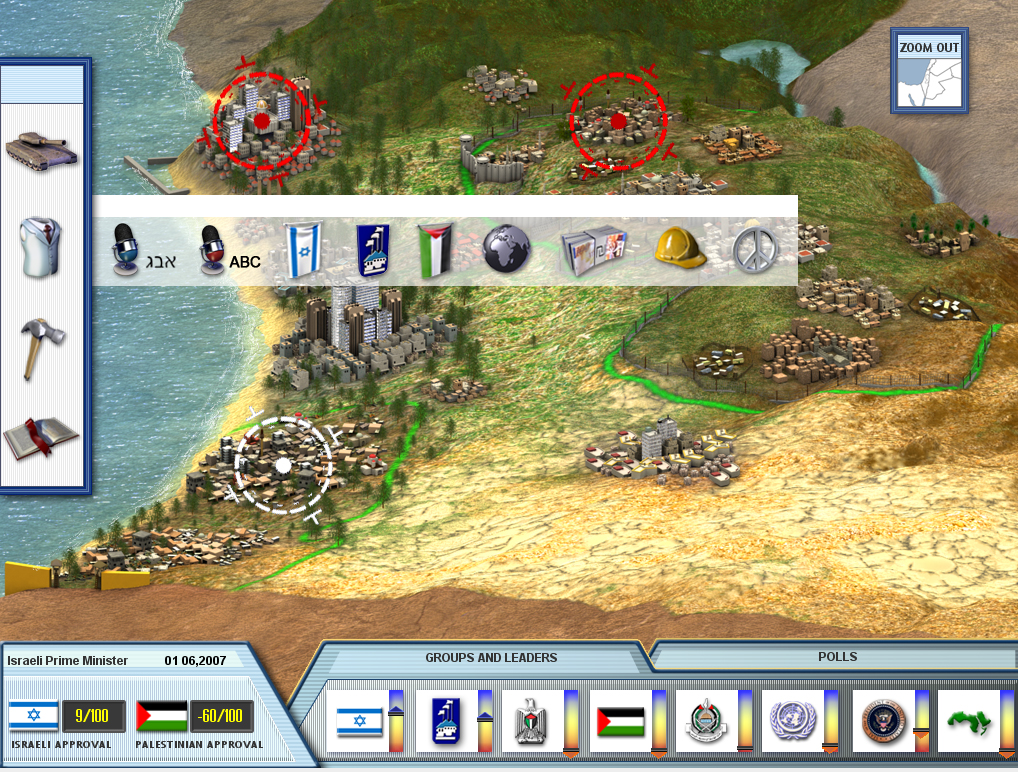 Abbildung 1. Israelischer Premierminister oder palästinensische Präsidentin? In der politischen Simulation PeaceMaker wählen Spieler/-innen eine der Rollen und müssen den Israel-Palästina-Konflikt friedlich lösen. (Bild: Benutzeroberfläche PeaceMaker, Courtesy of Impact Games LLC)Warum und wie wirken EE-Angebote?