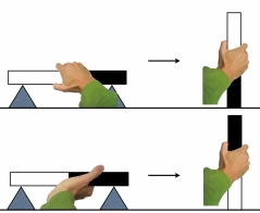 Ein anderes Beispiel für antizipatives Greifen können Sie beobachten, wenn Sie einen Ordner aufrecht auf einen Tisch stellen und eine andere Person bitten, diesen entweder ganz oben oder ganz unten in einen Schrank zu stellen (Abbildung 2). Soll der Ordner oben eingeräumt werden, wird die Person ihn weiter unten greifen als wenn er unten eingeräumt werden soll. So vermeidet man, sich zu sehr strecken oder bücken zu müssen. Die antizipative Auswahl der Greiforientierung und -position haben einen ähnlichen Zweck. Sie verhindert, dass für die Objektbewegung eine Bewegung des Armes nötig wird, die wir nur schwer oder vielleicht gar nicht ausführen können.