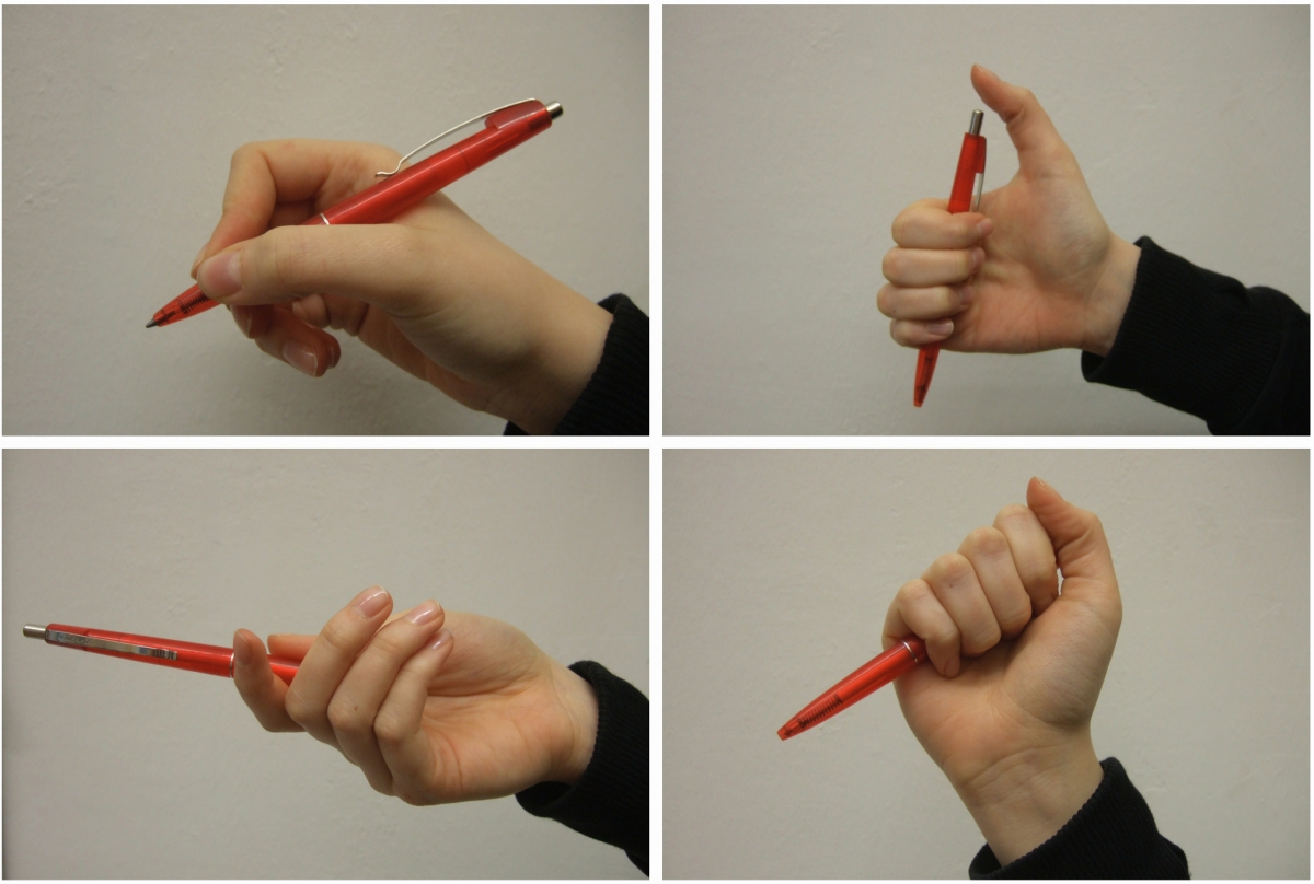 Abbildung 4. Antizipatives Verhalten vereinfacht auch die Zusammenarbeit mit anderen. Man kann aufgrund der unterschiedlichen Greifarten leicht erahnen, wie die Person im Bild den Stift benutzen wird. In der Abbildung links unten wurde so gegriffen, dass eine andere Person den Stift leicht entgegennehmen kann. Es wurden also sogar die Erfordernisse der Bewegungen einer anderen Person mitberücksichtigt. Beim rechts unten gewählten Griff ist weniger rücksichtsvolles Sozialverhalten zu befürchten.Welche Rolle die antizipative Anpassung an während einer Bewegung auftretende Kraft hat, kann man mit einem kleinen Experiment nachvollziehen. Dazu bittet man jemanden, einem einen schweren, vorzugsweise unzerbrechlichen, Gegenstand aus kurzer Höhe plötzlich in die Hand fallen zu lassen. Eine große PET-Flasche stilles Wasser oder ein dickes Buch eignen sich hervorragend. Man versucht dann beispielsweise das Buch einhändig und mit gestrecktem Arm aufzufangen, ohne dass sich der Arm bewegt. Der eigene Arm wird jedoch nach dem Greifen des Buches unvermeidlich nach unten sinken. Erst nachdem man sich auf die neue Belastung eingestellt hat, bewegt er sich an die ursprüngliche Position zurück. Lässt man sich das Buch jedoch selbst in die Hand fallen, wird es sich nach dem Greifen kaum bewegen. Dies liegt daran, dass man natürlich weiß, wann man den Gegenstand loslässt. Dementsprechend kann bereits