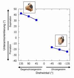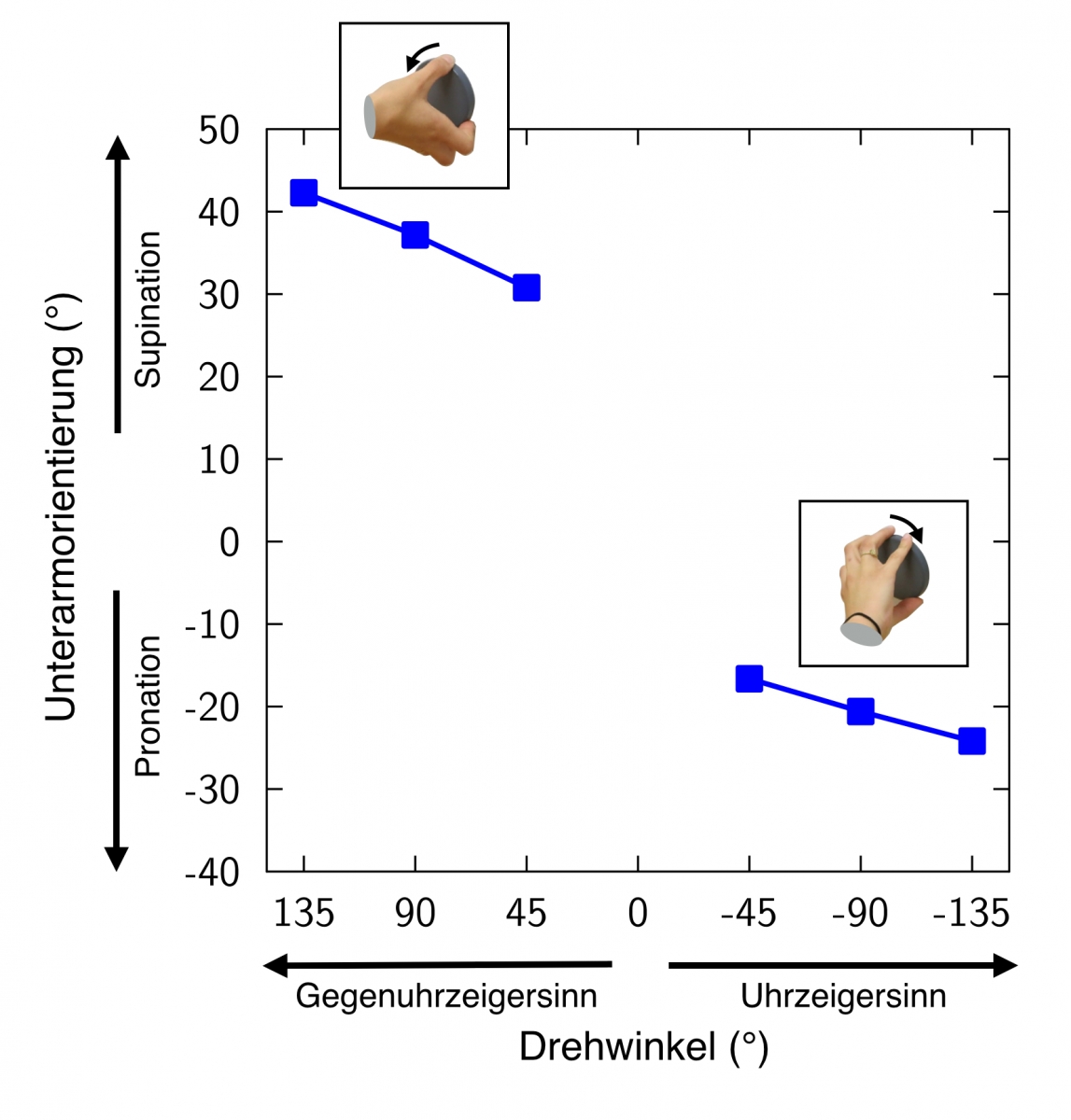 Abbildung 5. Die Orientierung der rechten Hand beim Greifen eines Drehreglers hängt hauptsächlich von der Richtung und weniger von der Weite der geplanten Drehbewegung ab (Daten aus Herbort und Butz, 2010).Es gibt zwar Hinweise darauf, dass das Gehirn solche komplexen Berechnungen durchführt (Johnson, 2000), neuere Forschungen sprechen aber dafür, dass es sich in vielen Fällen eines einfachen Tricks bedient. Zu dieser Annahme führten Experimente, in denen Versuchspersonen einen runden Griff greifen und drehen sollten (eine kleine Übersicht findet sich in Herbort, 2013). In manchen Experimenten war dies ein Drehregler, ähnlich dem Lautstärkeregler an einer Stereoanlage, in anderen Versuchen konnte mit dem runden Griff ein ganzes Objekt bewegt werden. Es zeigte sich, dass die Richtung der Drehbewegung einen relativ großen Einfluss auf die Greifbewegung hat. Die Weite der Drehbewegung hat dagegen nur einen kleineren Einfluss (Abbildung 5). Sie können diesen Effekt selbst leicht beobachten. Bitten Sie jemanden, einen Lautstärkeregler (oder Ähnliches) nur um wenige Grad im oder gegen den Uhrzeigersinn zu drehen. Wahrscheinlich wird die Person den Regler trotzdem auf sehr unterschiedliche Arten greifen. Und wahrscheinlich ändert sich die Greifbewegung kaum, wenn sie den Regler etwas weiter drehen soll.