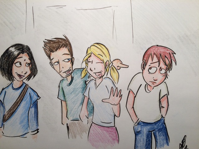 Soziale Ausgrenzung auf dem Schulhof: Opfer von Mobbing stehen oft alleine einer ganzen Gruppen gegenüber. Bild: Gezeichnet und Eigentum von Marianne Kauer.
