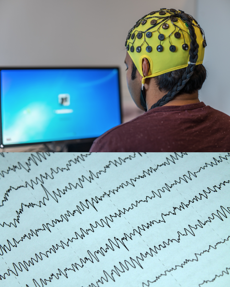 Bild 4: Rechts: Eine Versuchsperson mit Metallringen auf dem Kopf, mit denen wir die Aktivität des Gehirns messen. Links: Die Aktivität des Gehirns wird dann für jeden Metallring am Computer als eine solche wellige Linie dargestellt. der beiden Orte des Gehirns ist dafür bekannt, bei der Verarbeitung von Gefühlen beteiligt zu sein, der andere Ort des Gehirns dafür, das