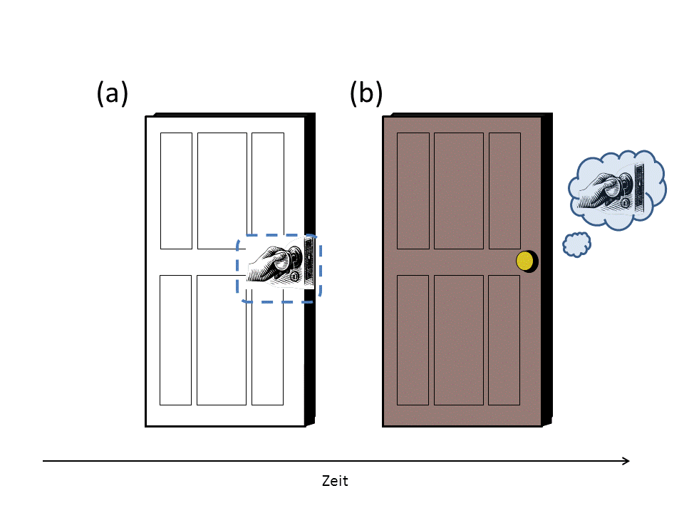 Abbildung 1: Entstehung und Abruf einer Reiz-Reaktions-Episode: (a) Der Türgriff und die zeitgleich ausgeführte „Ziehen“ Reaktion werden als gemeinsame Instanz im Gedächtnis gespeichert. (b) Begegnet man demselben (oder einem ähnlichen) Reiz später erneut, ruft dieser automatisch die frühere Verarbeitungsepisode aus dem Gedächtnis ab. Dadurch wird auch die damals gezeigte Reaktion aktiviert und kann schneller wieder ausgeführt werden als eine Reaktion, die erst bewusst geplant werden muss.Situationen wie diese sind alltäglich und jeder von uns hat sie in ähnlicher Weise sicherlich schon einmal erlebt. Eigentlich sind sie aufgrund ihrer Alltäglichkeit schon wieder unspektakulär: triviale Routine. Aber haben Sie sich schon mal gefragt, wieso Sie zum Beispiel Auto fahren und sich gleichzeitig Gedanken über „Wichtigeres“, wie beispielsweise ihren Einkauf, machen können? Und wie gelingt es, dass Sie dennoch rechtzeitig reagieren können, wenn etwas Unerwartetes passiert (wie das plötzliche Abbremsen Ihres Vordermanns)? Viele, wenn nicht die meisten unserer alltäglichen Handlungen verrichten wir quasi „auf Autopilot“, das heißt, ohne groß darüber nachzudenken, was wir gerade machen. Und das funktioniert erstaunlich gut: Selten kommt es zu Problemen oder Fehlern. Die Tatsache, dass wir dies können, verdanken wir einer Vielzahl sehr effizienter kognitiver Prozesse, die unser Verhalten automatisch steuern. Aber welche Prozesse sind das genau, und wie funktionieren sie? Darum soll es im Folgenden gehen.