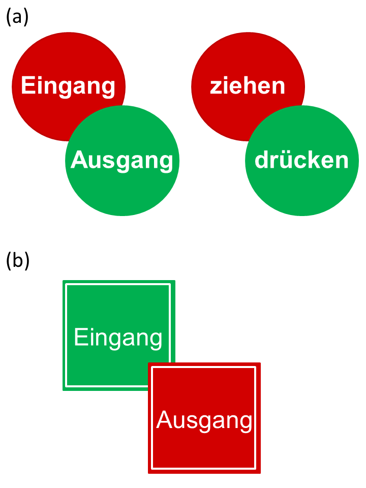 Abbildung 4: (a) Irrelevante Reize (wie die Hintergrundfarbe der Aufkleber) sind informativ für Verhalten, weil sie oft gemeinsam mit relevanten Reizen (hier z.B. die Wörter „drücken“ oder „ziehen“) auftreten. Die Hintergrundfarbe wird dadurch ebenfalls mit der geforderten Reaktion assoziiert, was eine Aktivierung der benötigten Reaktion zusätzlich fördert. (b) Jedoch sind irrelevante Reize nicht die zuverlässigsten Garanten für adäquates Verhalten: Ein rotes Schild mit der Aufschrift „Ausgang“ verleitet zur falschen Reaktion (ziehen), obwohl die Tür durch Drücken zu öffnen ist.Beispiele für solche Regelmäßigkeiten finden sich natürlich auch außerhalb des Straßenverkehrs. In unserem Alltag begegnen uns häufig Aufkleber auf Türen mit der Inschrift „ziehen“ / „Eingang“ oder „drücken“ / „Ausgang“, die uns dazu anleiten sollen, die richtige Reaktion auszuführen. Typischerweise sind diese Inschriften auf bestimmten Hintergrundfarben gedruckt („Eingang“ und „ziehen“ sind oft rot hinterlegt; „Ausgang“ und „drücken“ dagegen sind grün hinterlegt, siehe Abb. 4a). Die Hintergrundfarbe des Aufklebers wird dann ebenfalls mit der instruierten Reaktion assoziiert, was eine Aktivierung der geforderten Reaktion zusätzlich befördert. An dieser Stelle ist jedoch zu sagen, dass irrelevante Reize unzuverlässige Hinweisreize für korrektes Verhalten sind. Entsprechend konnte gezeigt werden, dass der durch irrelevante Reize ausgelöste automatische