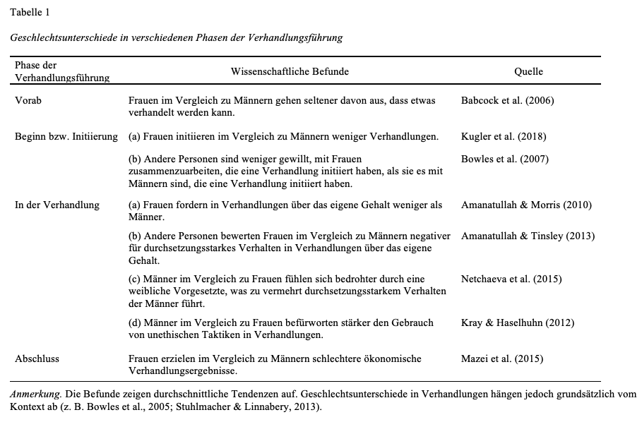 Frauen und Männer unterscheiden sich voneinander in verschiedenen Phasen der Verhandlungsführung (Stuhlmacher & Linnabery, 2013). Eine Übersicht zu diesen Unterschieden ist in Tabelle 1 gegeben.
