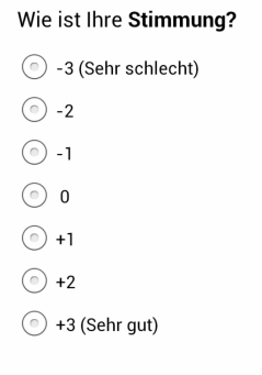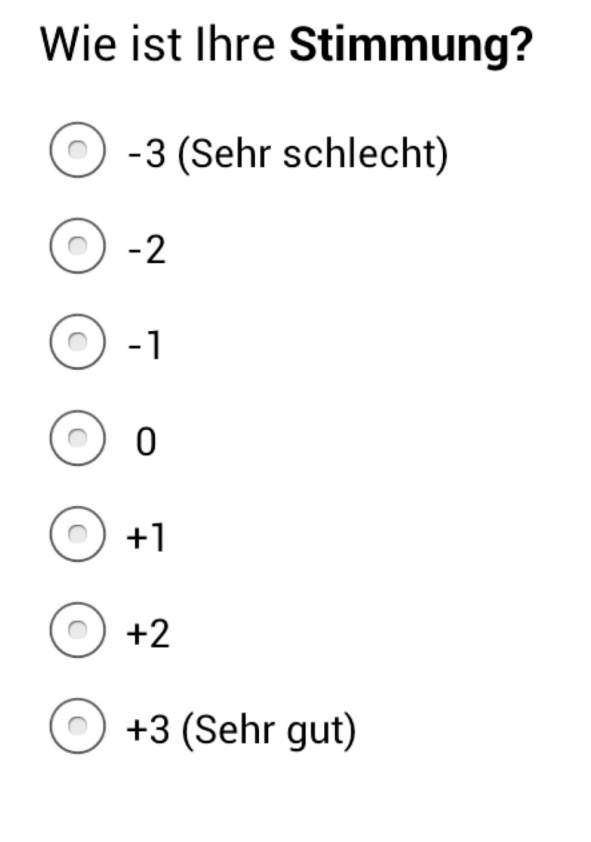 Abbildung 2. Kognitive Empathie kann im Alltag mit Hilfe von zeitlich gekoppelten Smartphones erfasst werden: Zwei Personen können damit ihre eigene aktuelle Gefühlslage und die ihres Partners bewerten (Beispiel für eine auf einem Smartphone-Bildschirm dargestellte Frage angelehnt an Rauers et al., 2013).älteren Paaren untersuchte (Rauers et al., 2013). Die Teilnehmer/-innen trugen Smartphones bei sich, während sie ihrem normalen Alltag nachgingen. Über einen längeren Zeitraum hinweg signalisierten ihnen die Telefone sechs Mal täglich, ihre eigenen Gefühle und die Gefühle ihres Partners oder ihrer Partnerin zu bewerten (siehe Abbildung 2). Der Bericht einer Person über die andere konnte dann mit dem tatsächlichen Befinden dieser Person verglichen werden.