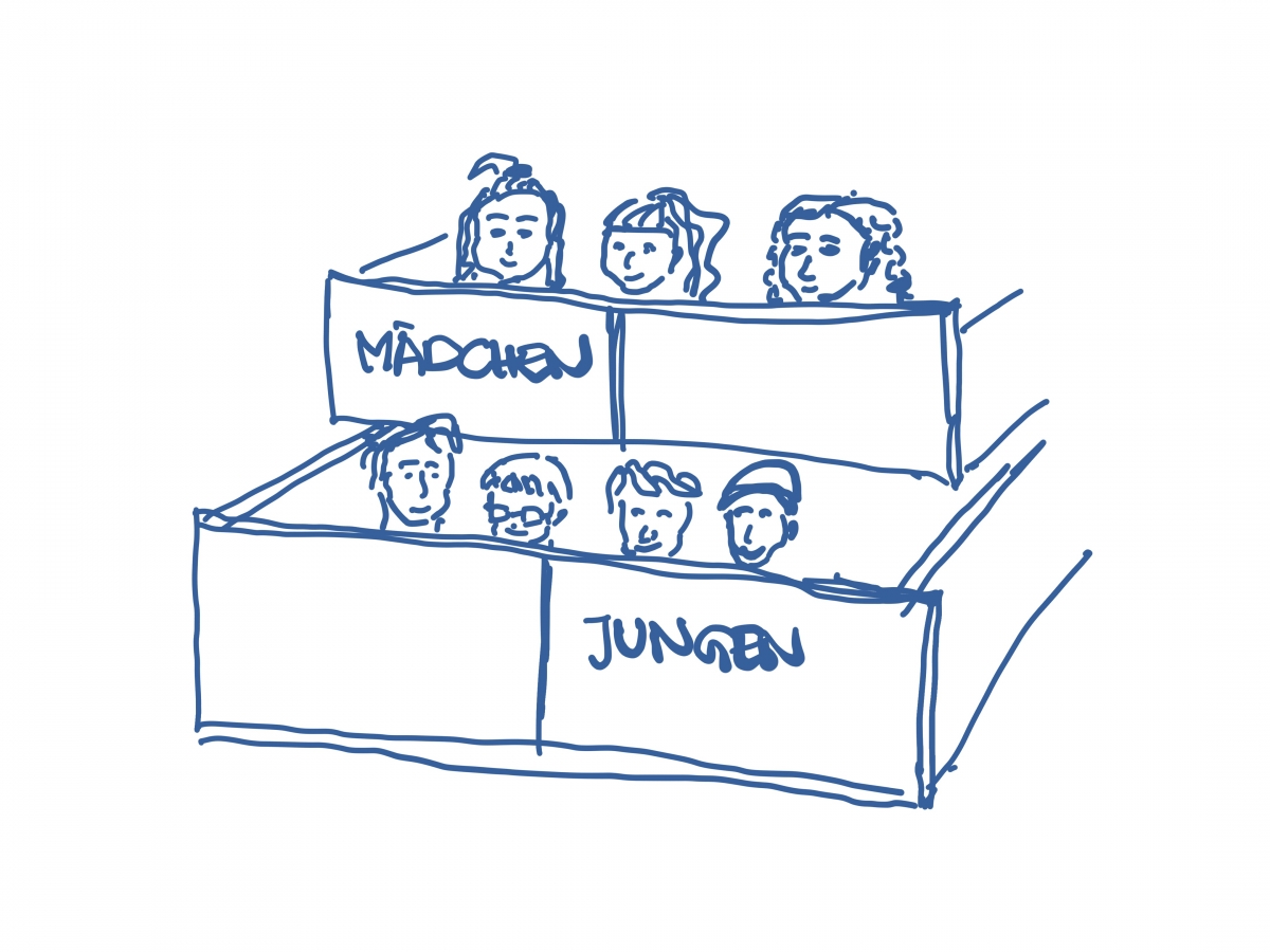 Vielleicht hast du schon mal vom „Schubladen-Denken“ gehört. Damit ist gemeint, dass wir beim Denken alles, was für uns zusammengehört, in die gleiche Schublade stecken – wie beim Aufräumen in deinem Zimmer: Die Socken kommen in die Sockenschublade, die Spiele in die Spieleschublade und so weiter. Aber beim Schubladen-Denken ist natürlich keine echte Schublade gemeint. Und es geht auch nicht darum, irgendwelche Spielsachen aufzuräumen. Sondern es geht darum, dass wir in unserem Kopf andere Menschen in Schubladen einordnen – so, wie wir das mit unseren Spielsachen beim Aufräumen auch tun.