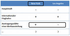 © Martha Michalkiewiczadt eines Landes? Nein, keine. Hat eine der beiden Städte einen internationalen Flughafen? Ja, beide. War eine der beiden Städte irgendwann Austragungsort der Weltausstellung? Ja, New York, aber nicht Los Angeles. Somit entscheiden wir uns für New York, weil die erste Eigenschaft, die zwischen den beiden Städten unterscheidet, für New York spricht. Take-the-Best (zu Deutsch: Wähle das Beste), wird hier verstanden als: Entscheide Dich aufgrund der ersten zwischen den Alternativen differenzierenden Eigenschaft. Da die Eigenschaften zuvor anhand ihrer