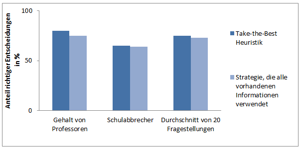 Take-the-Best Heuristik lieferte in einer Reihe von Experimenten genauso gute und teils bessere Ergebnisse verglichen mit komplizierteren Strategien (Czerlinski, Gigerenzer & Goldstein, 1999), beispielsweise bei Entscheidungen bezüglich des Gehalts von Professoren und Professorinnen und der Schulabbruchsquote von Jugendlichen (vgl. Abb. 3).