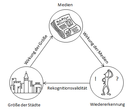 Rekognitionsvalidität entsteht durch Mediatoren wie Zeitungen, Fernsehen, Internet oder auch andere Menschen (vgl. Abb. 4). Große Städte werden häufiger in den Medien erwähnt, was die Wahrscheinlichkeit erhöht, dass eine Stadt wiedererkannt wird (Pachur, Todd, Gigerenzer, Schooler & Goldstein, 2012). Ein solcher Zusammenhang konnte auch für andere Bereiche, wie Sport und Wirtschaft, nachgewiesen werden (Pachur et al., 2012). So werden zum Beispiel unter TennisspielerInnen die Weltranglistenbesten und bei Unternehmen die erfolgreichsten am häufigsten erkannt. Eine Studie von Pohl (2006) hat gezeigt, dass Menschen die Verwendung einer