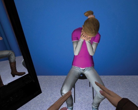 Die Behandlung in der virtuellen Welt könnte für umgrenzte Ängste schon bald den Sprung von der Forschung in die therapeutische Praxis schaffen. Wie ist der Stand bei anderen psychischen Erkrankungen? WährendBild (bearbeitet)von Chris Brewin via PLOS ONE (http://journals.plos.org/plosone/article?id=10.1371/journal.pone.0111933),CC: https://creativecommons.org/licenses/by/4.0/. einige Menschen mit Ängsten vor vermeintlichen Gefahren kämpfen, kämpfen andere täglich mit sich selbst. Sie üben harsche Selbstkritik und gehen streng mit sich ins Gericht – mitunter bis hin zur Depression. Kann VR auch diesen Menschen helfen? Eine Studie am University College London ging dieser Frage nach: Gesunde, besonders selbstkritische Frauen wurden auf raffinierte Weise in einen Körper in der virtuellen Welt versetzt (Falconer et al., 2014). Vor ihnen saß ein weinendes virtuelles Kind (siehe Bild), das die Probandinnen trösten sollten. Hatten sie diese Aufgabe erfüllt, schlüpften sie in den Körper des Kindes. Nach dem Wechsel in die Perspektive des Kindes empfingen sie ihren eigenen Trost: Sie wurden von der anderen Person so getröstet, wie sie selbst zuvor das Kind getröstet hatten. Die Ergebnisse sind ermutigend: Die Frauen fühlten sich nach dem virtuellen Erlebnis sicherer und berichteten mehr Mitgefühl für sich selbst. Und auch Depressiven scheint das Verfahren zu helfen (Falconer et al., 2016): In einer Folgestudie schlüpften depressive Personen zunächst in die Rolle der bzw. des Tröstenden, dann in die Rolle des getrösteten Kindes; insgesamt dreimal, jeweils im Abstand von einer Woche. Diese drei virtuellen Erlebnisse verringerten bei der Mehrheit die depressiven Symptome – und das sogar mit Bild (bearbeitet) von Chris Brewin via PLOS ONE (http://journals.plos.org/plosone/article?id=10.1371/journal.pone.0111933), CC: https://creativecommons.org/licenses/by/4.0/.Langzeitwirkung: Noch vier Wochen später berichteten die Betroffenen, weniger selbstkritisch und dafür mitfühlender sich selbst gegenüber zu sein. Die Ergebnisse sind vielversprechend, die Stichprobe war mit 15 Testpersonen jedoch klein. Weitere Studien mit größeren Stichproben müssen erforschen, ob solche virtuellen Interventionen tatsächlich zur Heilung von Depression geeignet sind.