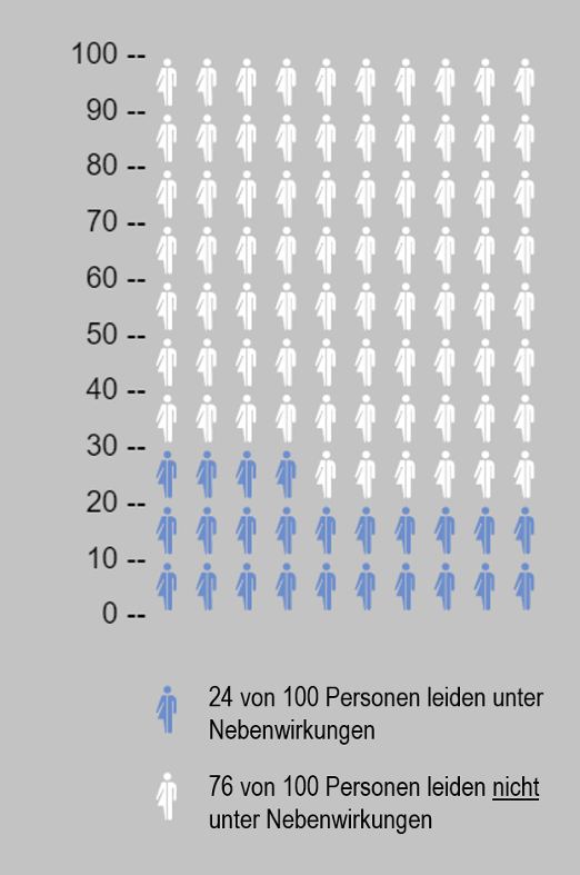 Icon Arrays kombinieren Empfehlungen für die Darstellung von Risikoinformationen, indem sie Zahlen visualisieren und den Bezug zur Grundgesamtheit verdeutlichen. In der Matrix stellen einige Icons, die durch eine andere Farbe hervorgehoben sind, die Anzahl der Personen dar, die in einem bestimmten Zeitraum von einer Krankheit oder einem Ereignis betroffen sind, in diesem Beispiel von einer Nebenwirkung des Medikaments. Die anderen Symbole repräsentieren die nicht betroffenen Personen, d.h. solche, die nicht unter Nebenwirkungen des Medikaments leiden. Aufgrund dieses Designs können Icon Arrays den Einfluss von Heuristiken und Verzerrungen auf die Wahrnehmung und Entscheidungsfindung reduzieren. So auch die Wirkung von persönlichen Anekdoten, da der Erfahrungsbericht (ob positiv oder negativ) besser ins Verhältnis zur gesamten Gruppe der potentiell Betroffenen gesetzt werden kann (Fagerlin et al., 2005).