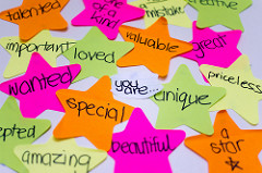 Self-esteem von Kiran Foster via Flickr (https://www.flickr.com/photos/rueful/8065467654), cc (https://creativecommons.org/licenses/by/2.0/)Affirmationen sind bewusst formulierte positive Gedanken. In Ratgebern wird zum Beispiel empfohlen, sich jeden Morgen vor den Spiegel zu stellen und positive Gedanken über sich selbst zu formulieren, wie zum Beispiel „Andere Menschen lieben und respektieren mich so, wie ich bin“,„Ich bin eine liebenswerte Person“ oder „Ich bin ein Geschenk für die Welt“. Dies sollte dann den